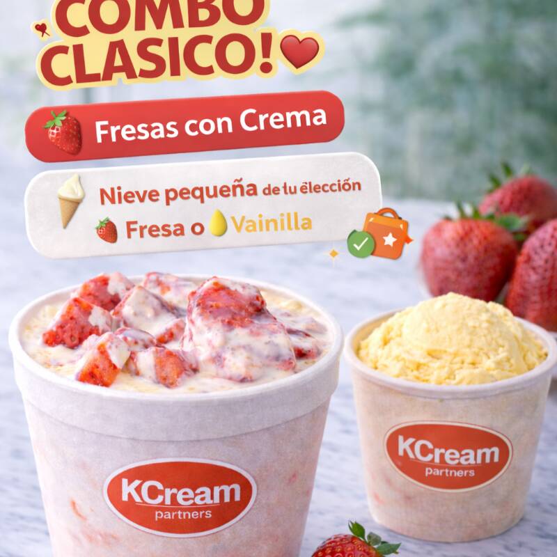 El combo perfecto para un antojo completo: Nuestras deliciosas fresas con crema acompañadas de una nieve pequeña de vainilla o fresa para disfrutar frio y sin complicaciones. Especial para consentirte