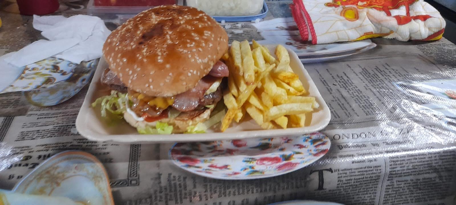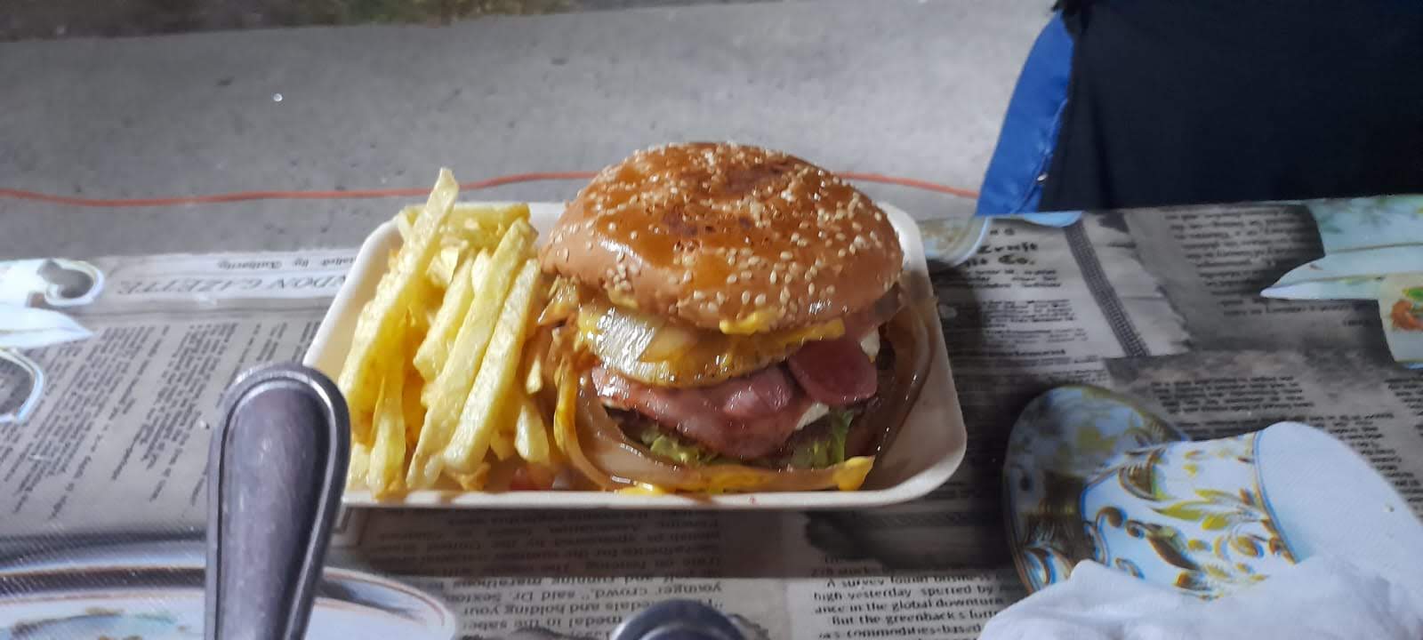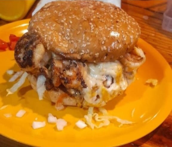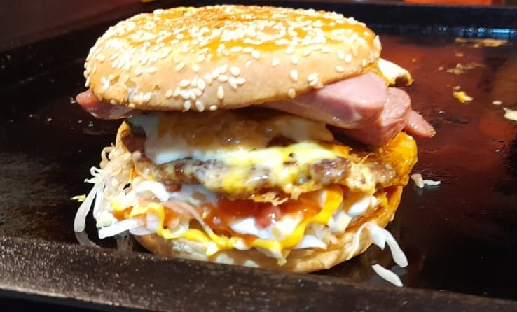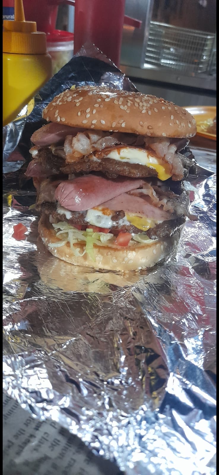 Doble de hamburguesa ranchera (carne, queso amarillo, chihuahua, jamón, salchicha y tocino).