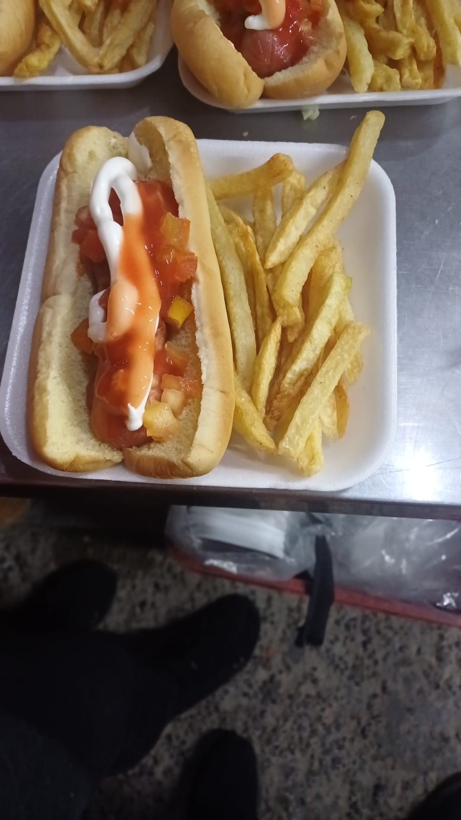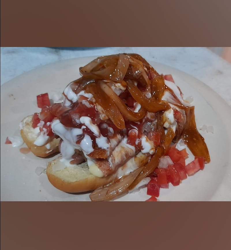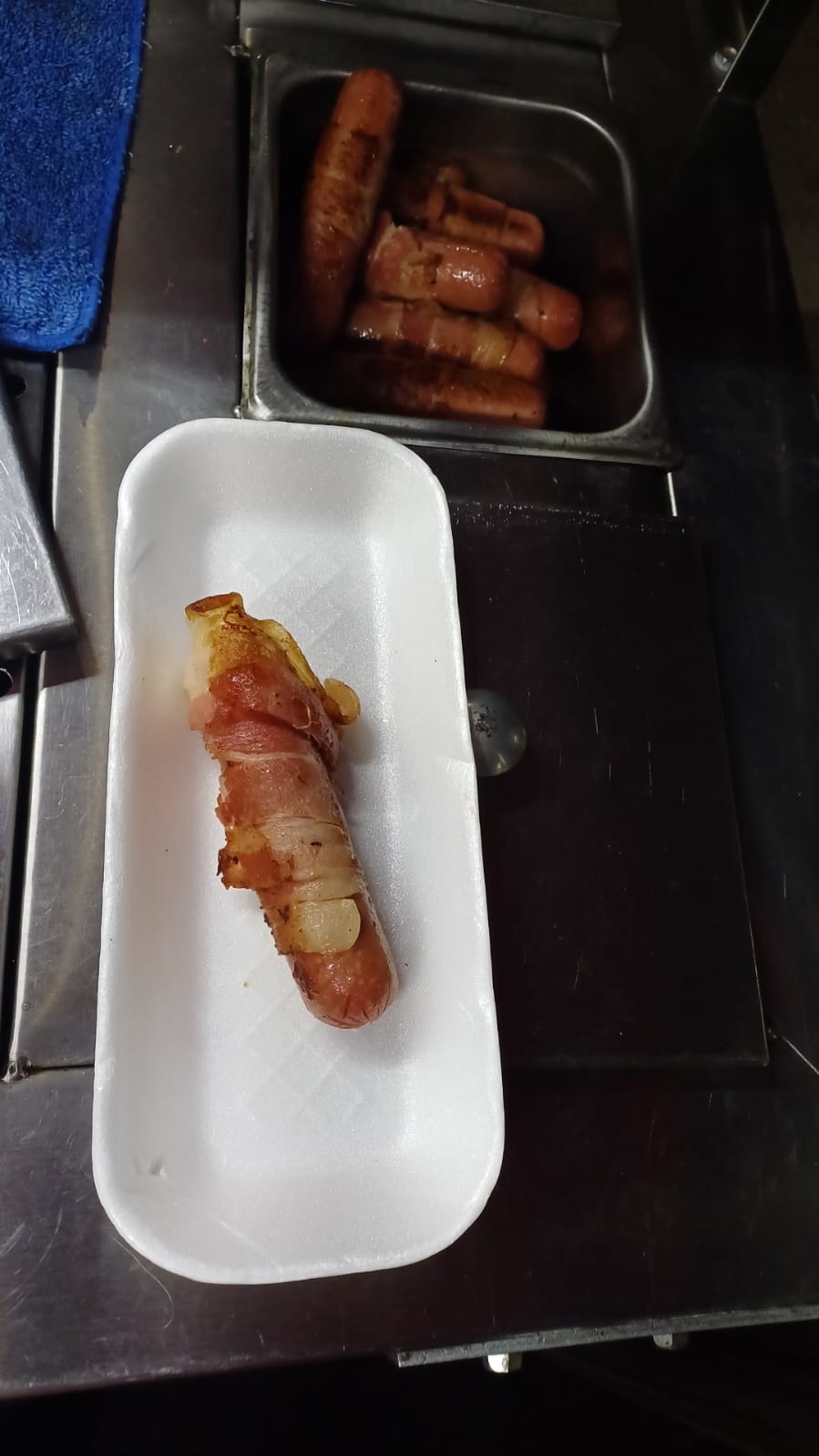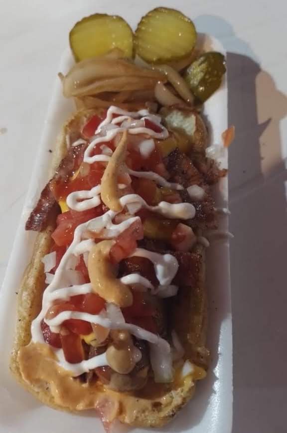 Salchicha con tocino, jamón. chihuahua, verduras y aderezos.