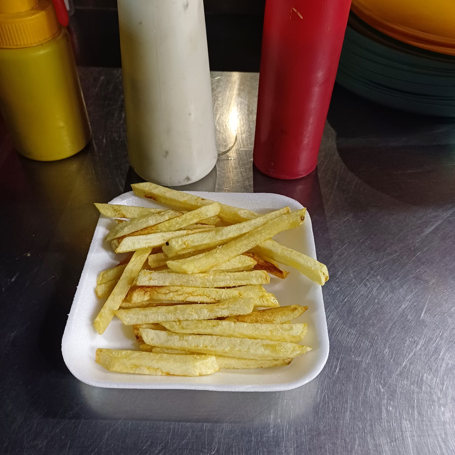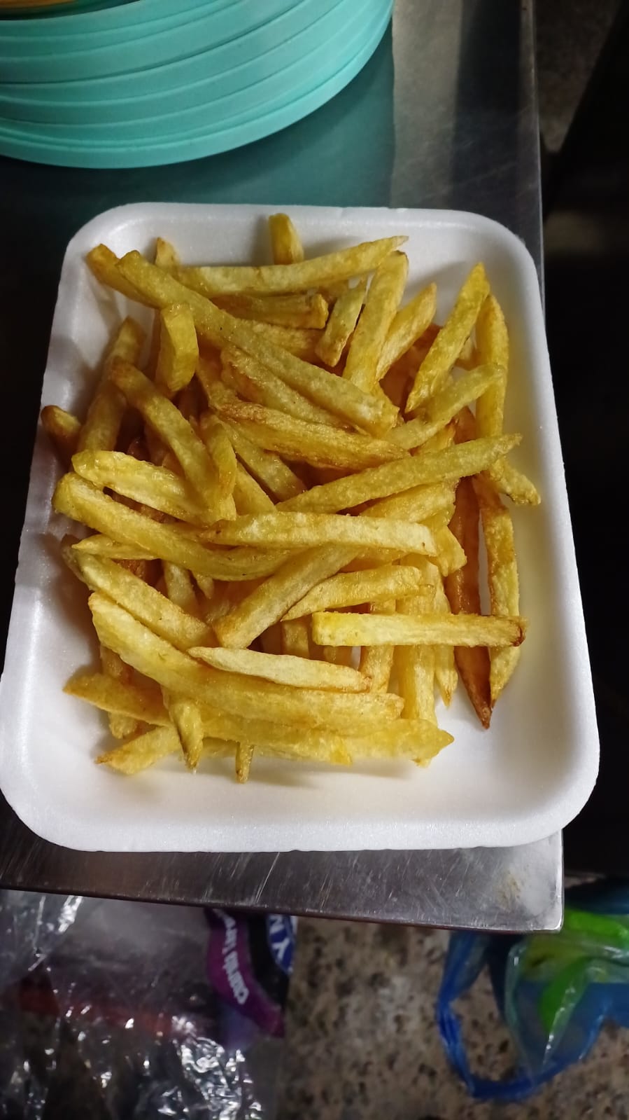 Orden de papa, salchicha, tocino, chihuahua, aderezos y cebollitas.