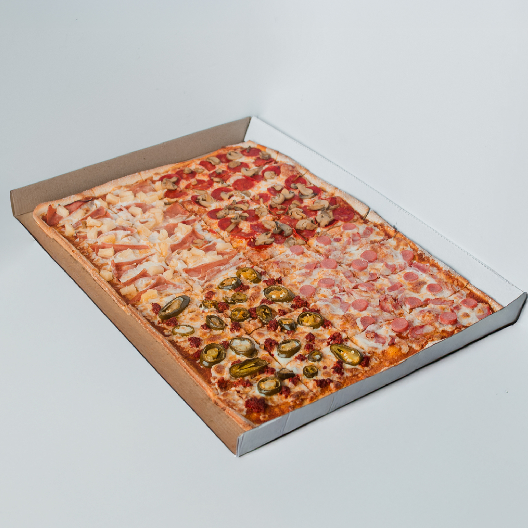 Pizza casera de 40 trozos con salsa de tomate y queso (Peperoni, Champiñón, Jamón, Piña, Salchicha, Tocino, Chorizo y Jalapeño).