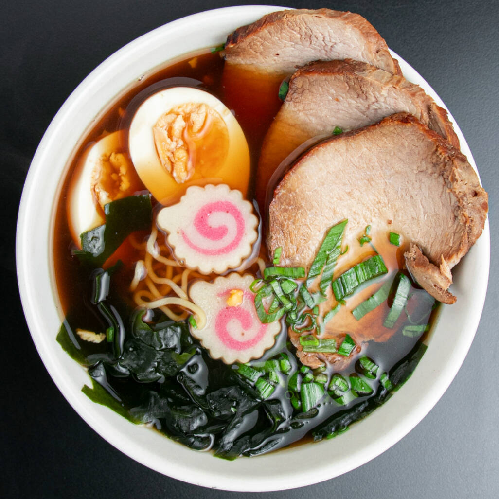 Pasta ramen, lomo de cerdo, naruto, huevo, cebollín y alga deshidratada