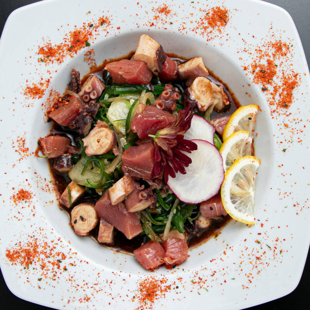 Wakame fresco, pepino, cebolla, pulpo y atún. Bañada en salsa ponzu especial.