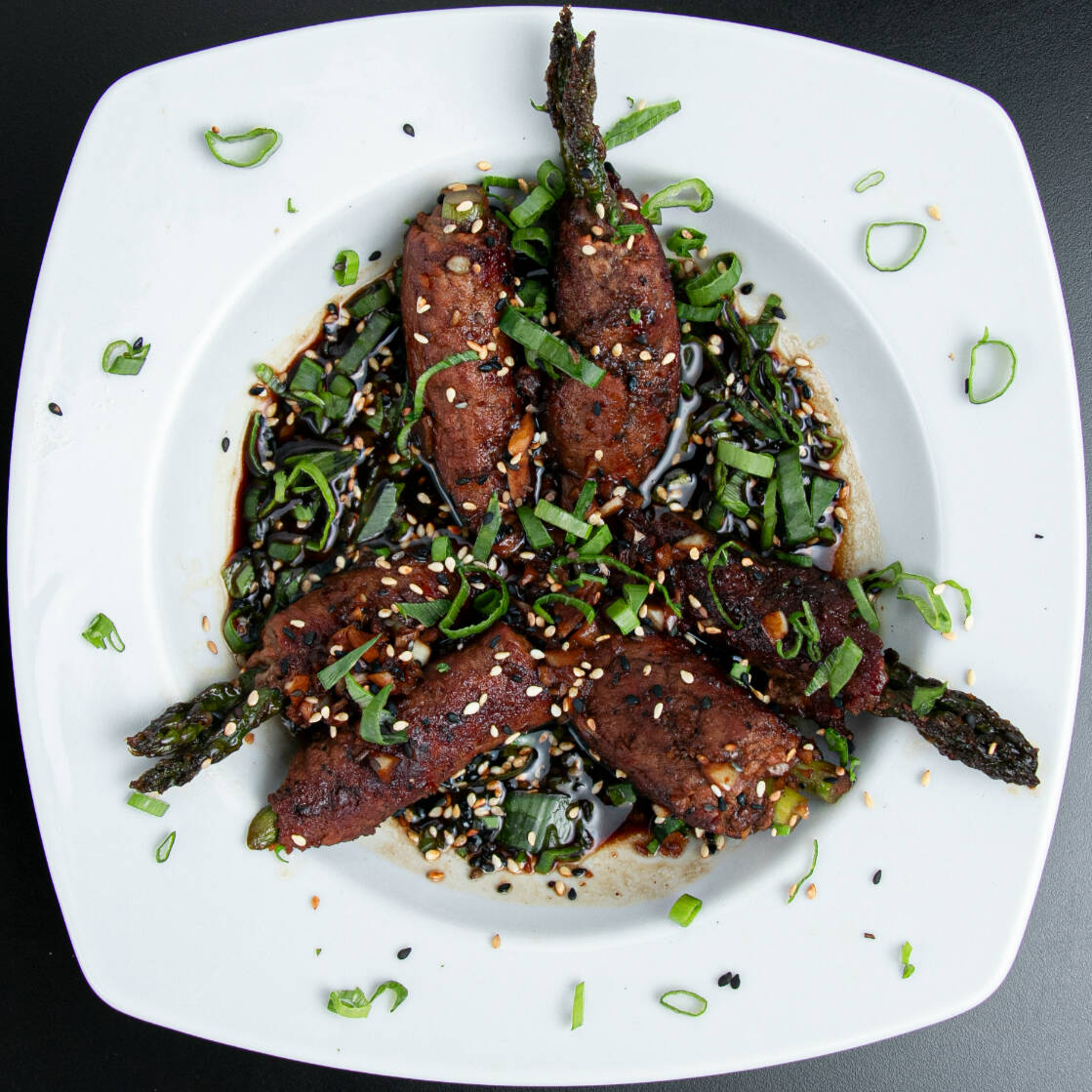 Esparragos envueltos en lete migñon y salteadoscon una rica salsa de soya con ajo.