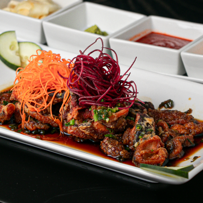 Chicharrón de pulpo salteado con cebollín, chile serrano y salsa ponzu.