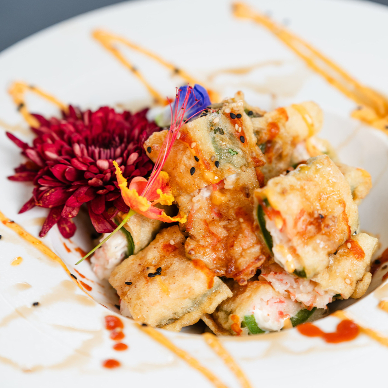 Chiles jalapeños rellenos de cangrejo y philadelphia, en tempura y bañados en nuestras salsas especiales (spicy mayo, sriracha, ponzu).