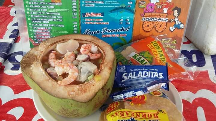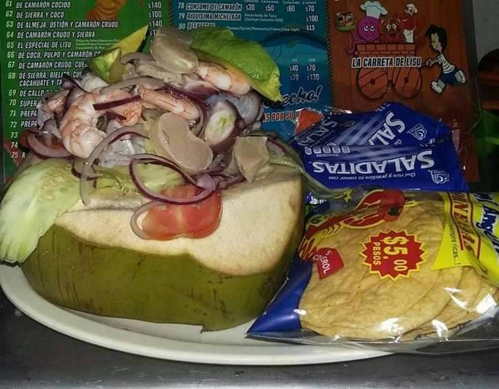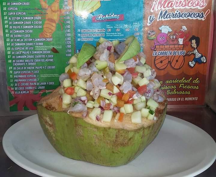 Coco Tiernito relleno de Camarón crudo tipo aguachile Camarón cocido Pulpo Ostión Caracol Almeja y Callo de Hacha