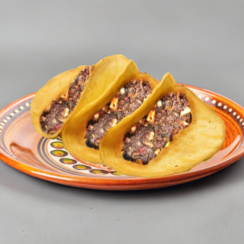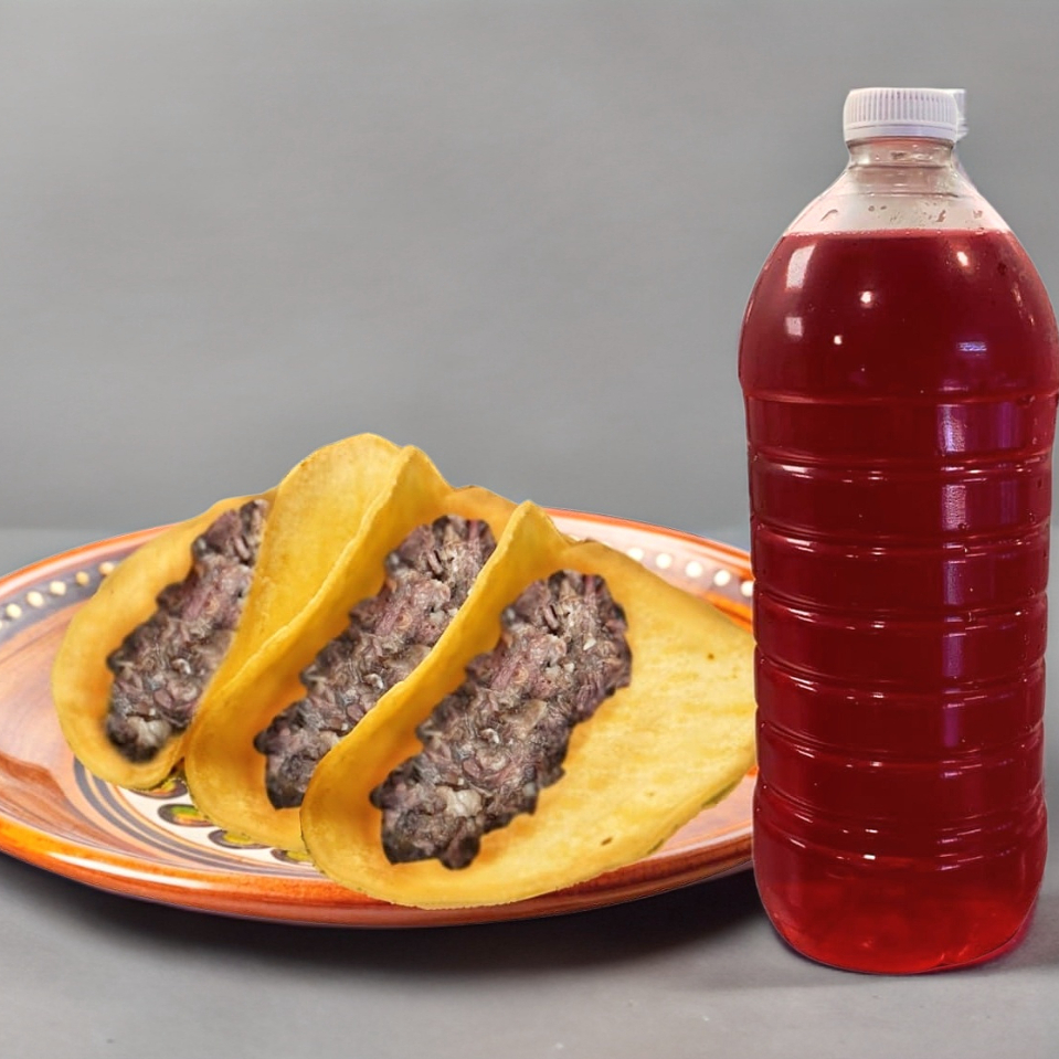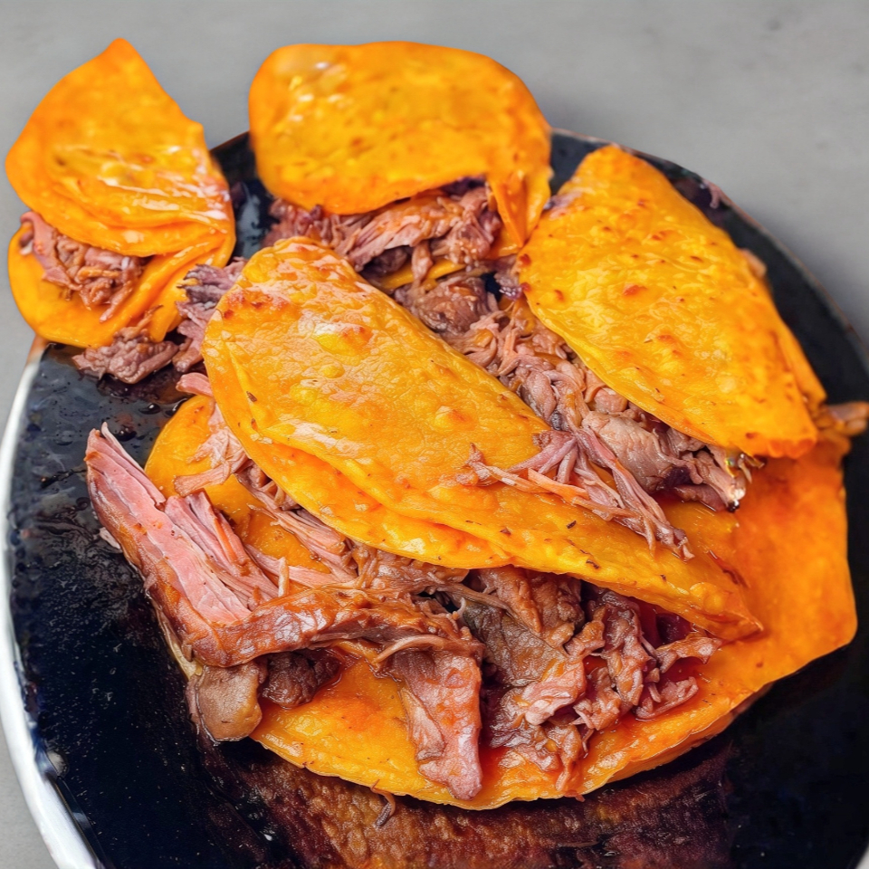 Doble Tortilla Dorada de Maiz, birria y queso gratinado + bebida