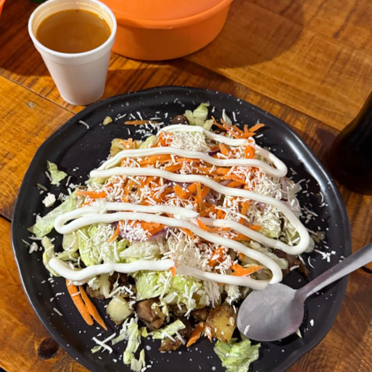 gordita de maiz con carne deshebrada, frijol, crema, queso, verdura y un delicioso caldito