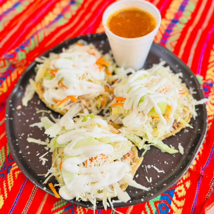 3 gorditas de maiz con pollo, frijol, crema, queso, verdura y un delicioso caldito