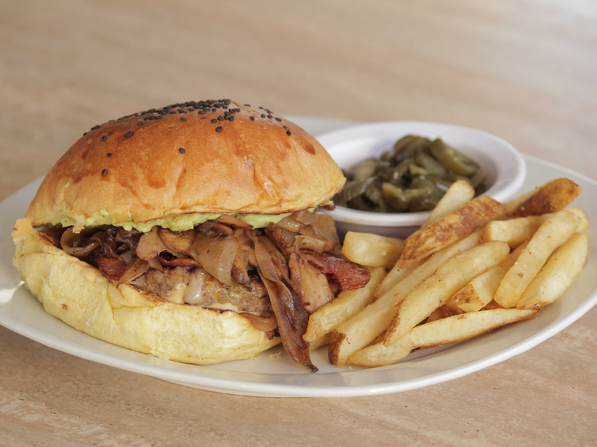 Hamburguesa con queso Chihuahua, cebolla y champiñones salteados, tocino y aguacate