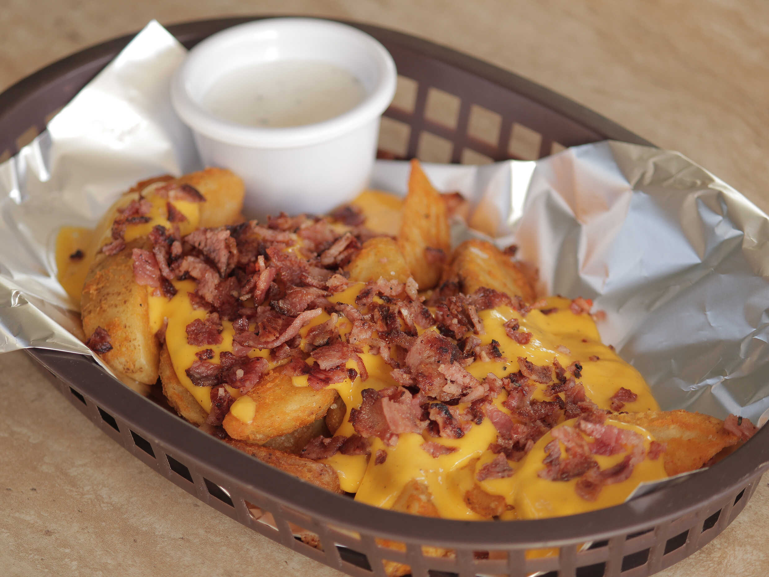 Papas gajo con queso de nachos, tocino y aderezo ranch.