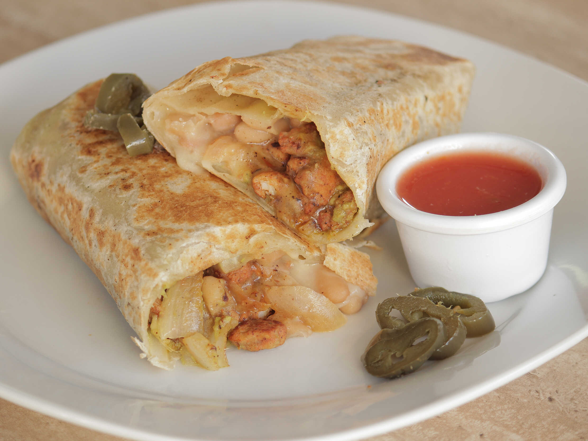 Tortilla de 30 cm rellena de carne asada, frijoles en bala, guacamole, repollo y delicioso queso Chihuahua (Amarrado mide un poco menos)