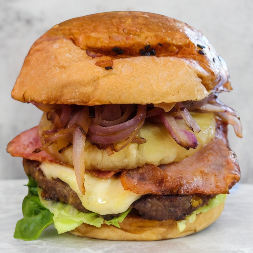 Hamburguesa con queso Chihuahua, jamón, piña y cebolla morada asadas, tocino, tomate y lechuga