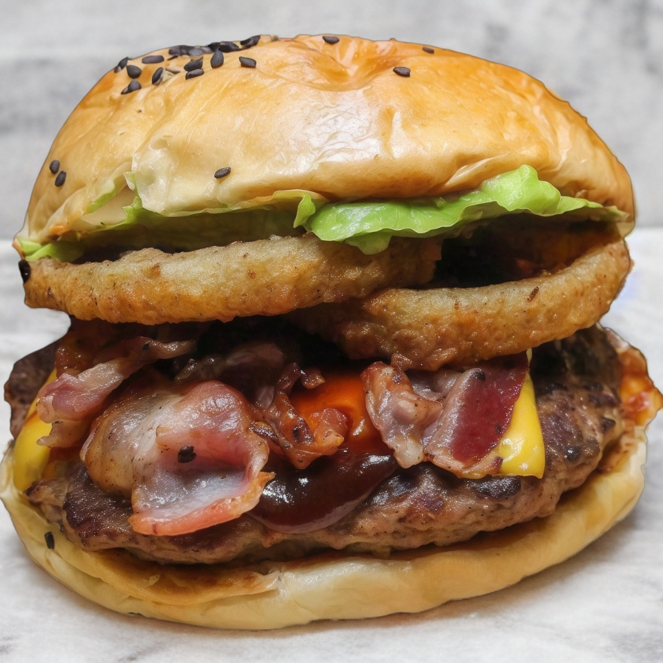 Hamburguesa con queso amarillo, tocino, aros de cebolla, salsa BBQ, guacamole y aderezo mil islas