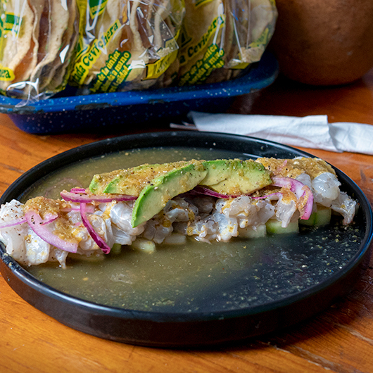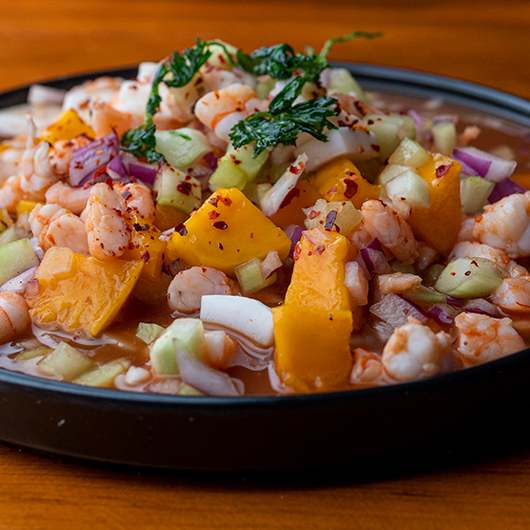 Camarón fresco 90 gr. y camarón cocido 50 gr., marinados en jugo de limón, salsas negras y un toque de clamato, mezclado con cubos de mango, coco pepino y cebolla, coronado con cilantro frito y hojuelas de chile quebrado.