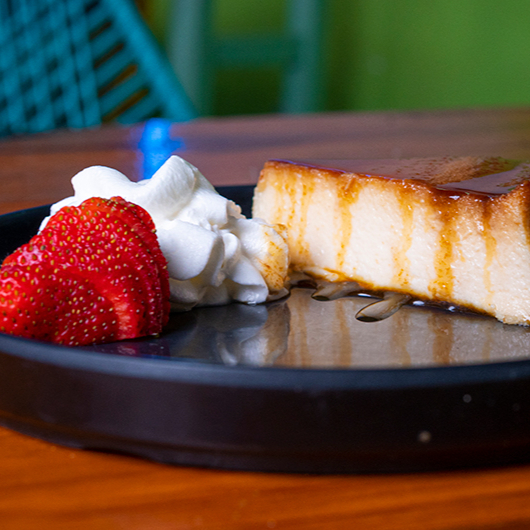 Flan casero, cubierto con dulce de leche y topping de crema batida y fresa fileteada.