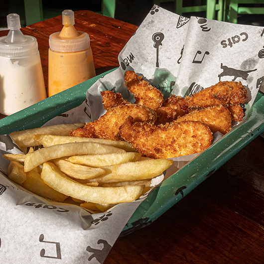 Tiras de pechuga de pollo (200 gr) empanizadas con nuestra receta secreta y acompañadas de papas a la francesa.