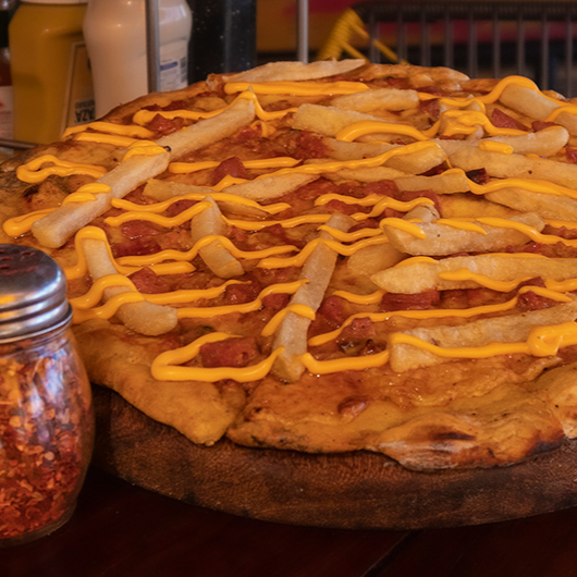 Papas a la francesa (300 gr) aderezadas con queso cheddar liquido, trocitos de tocino y chile jalapeño.