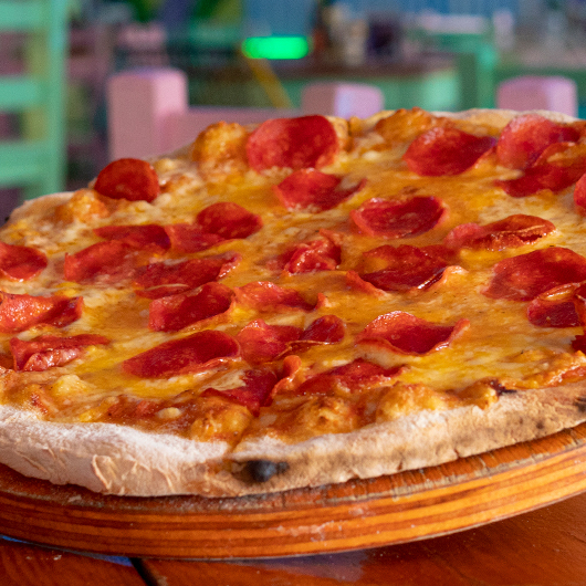 Mozzarella, pepperoni, tocino, jamón, salchicha italiana.