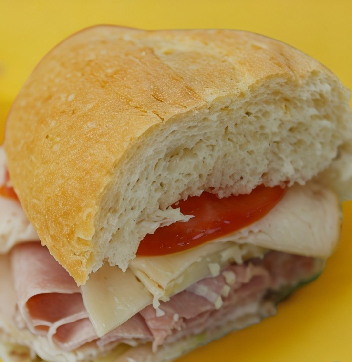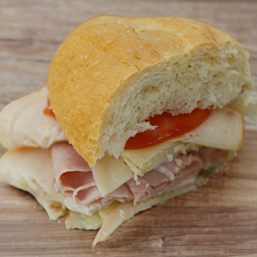 Torta con pierna, jamón, queso chihuahua, lechuga, tomate, cebolla, crema y aguacate