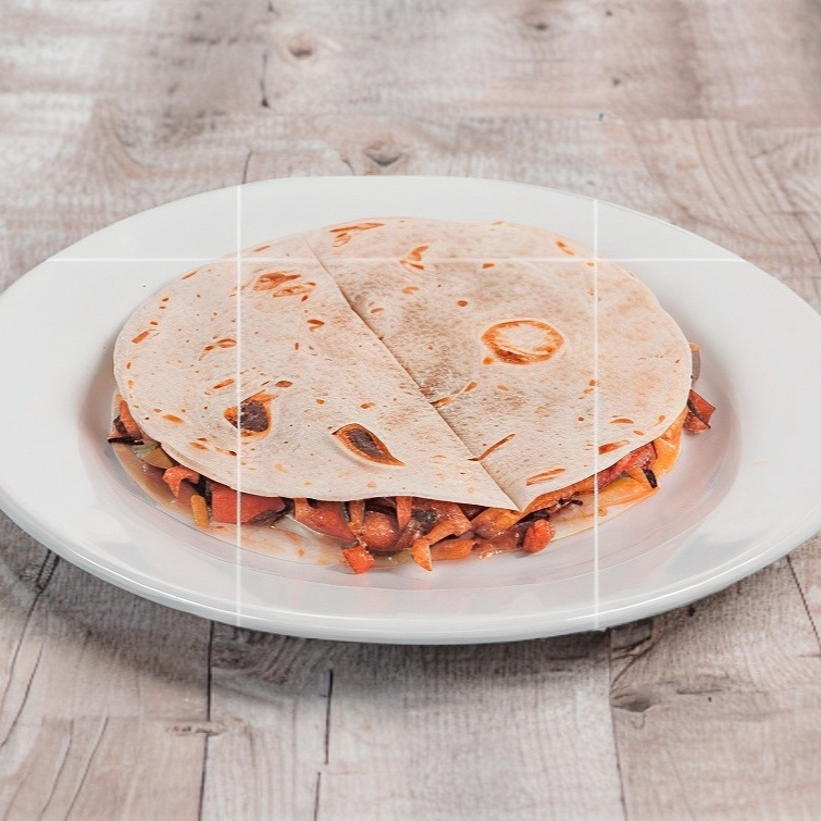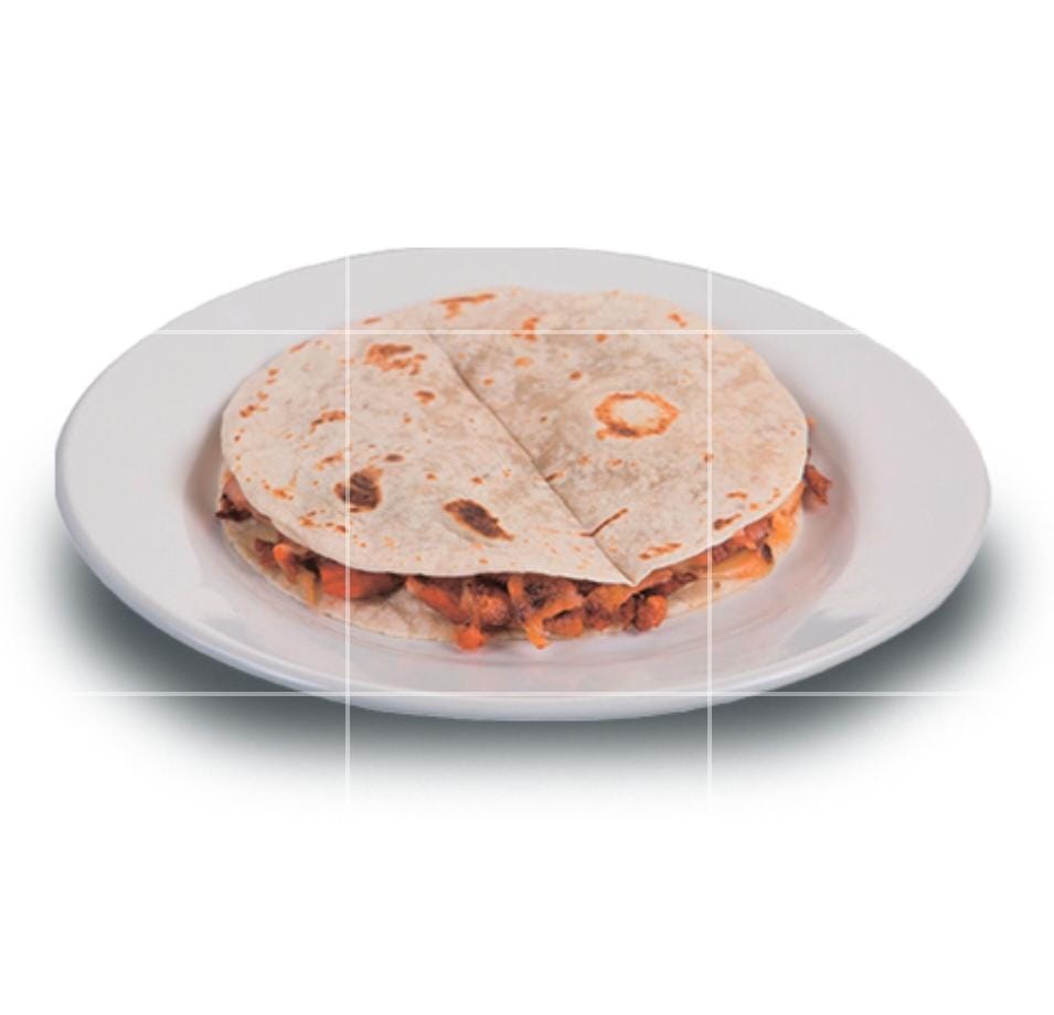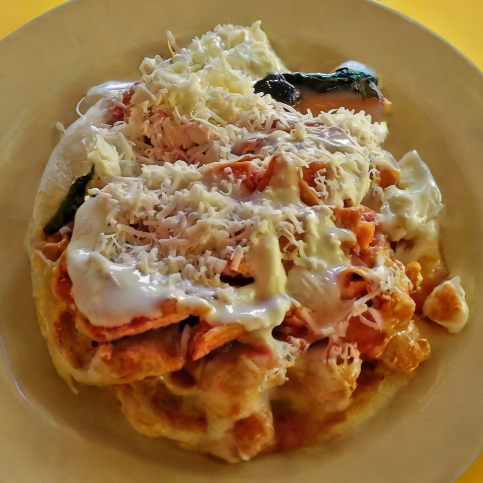 Tortilla de maiz horneada, de pollo deshebrado, verdura, crema y queso.