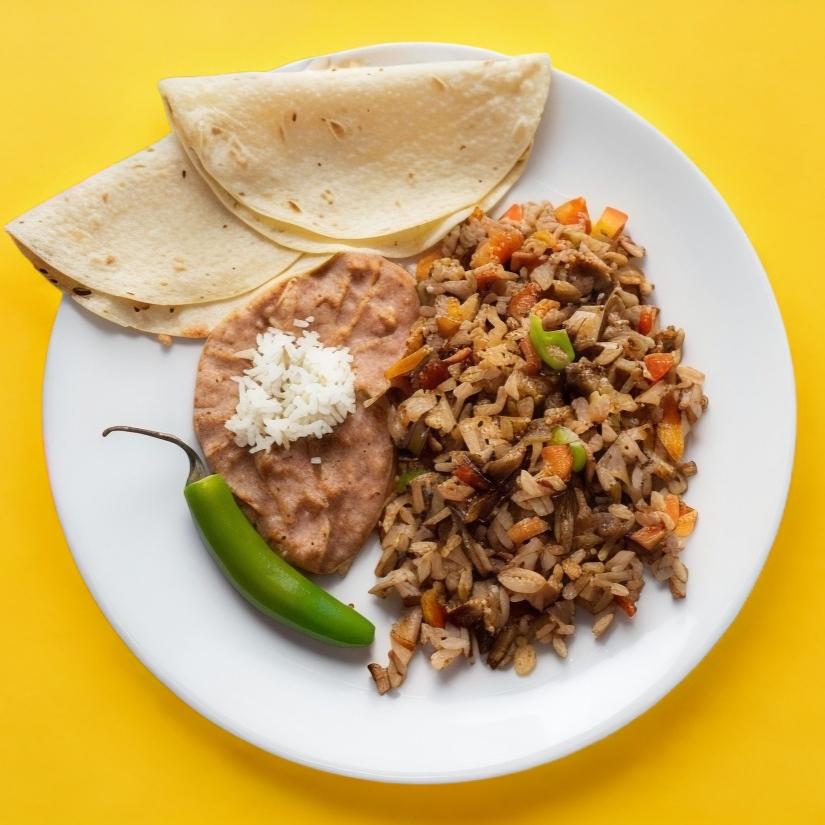 Pechuga de pollo a la plancha, acompañado de frijoles, salsa y tortillas.