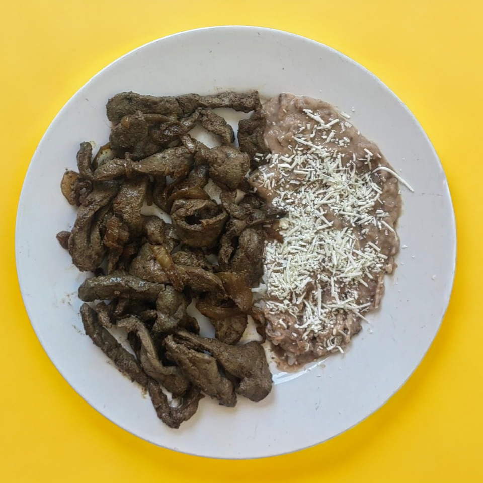 Bistec fileteado a la plancha, acompañado de frijolito, salsa y tortillas
