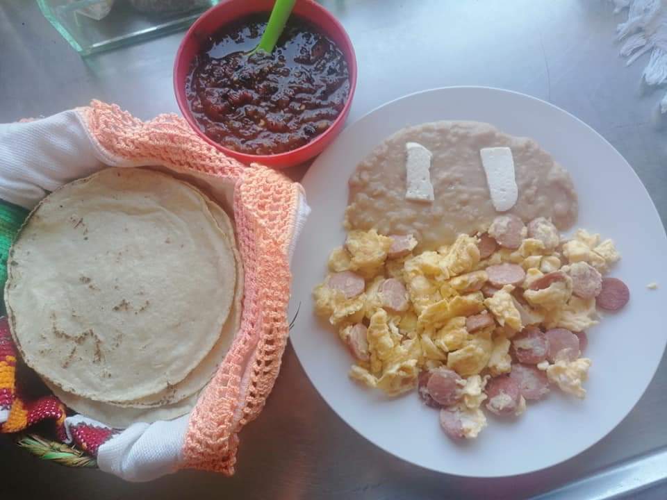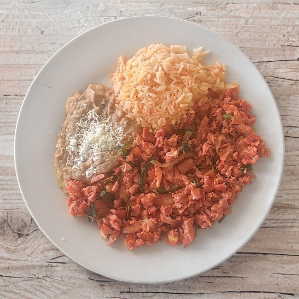 Chicharrón preparado con cebolla, chile serrano y jitomate, acompañado de frijol, salsa y tortillas hecgas a mano.