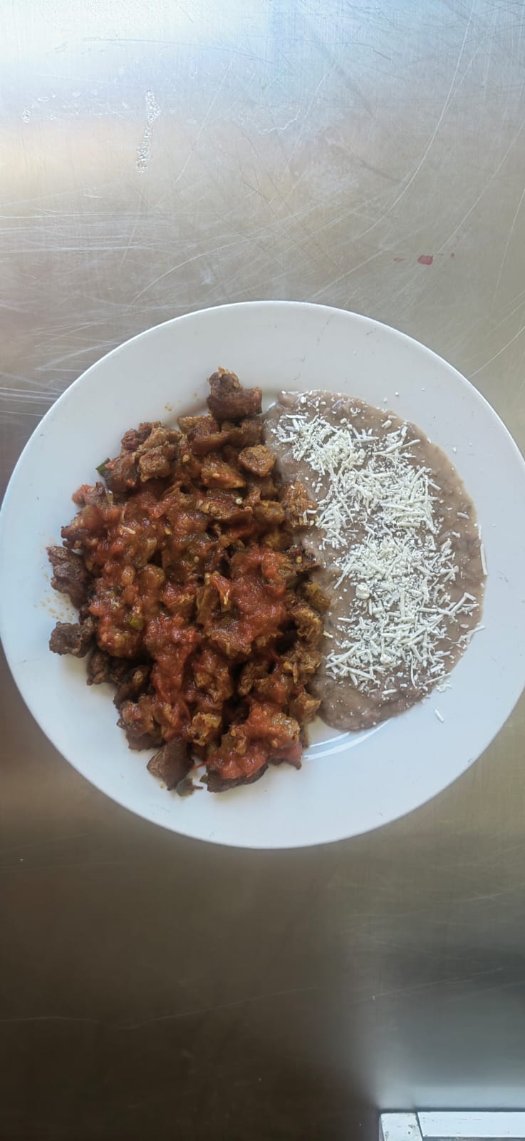 Machaca preparada, acompañados de frijolito, salsa y tortillas.