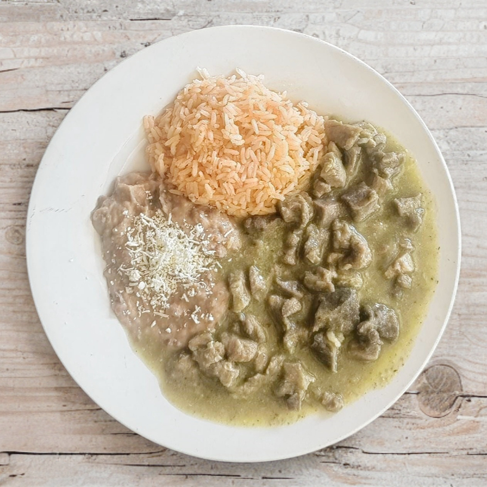 Mezcla de salsa tomatillo verde, acompañado con carne de res.
