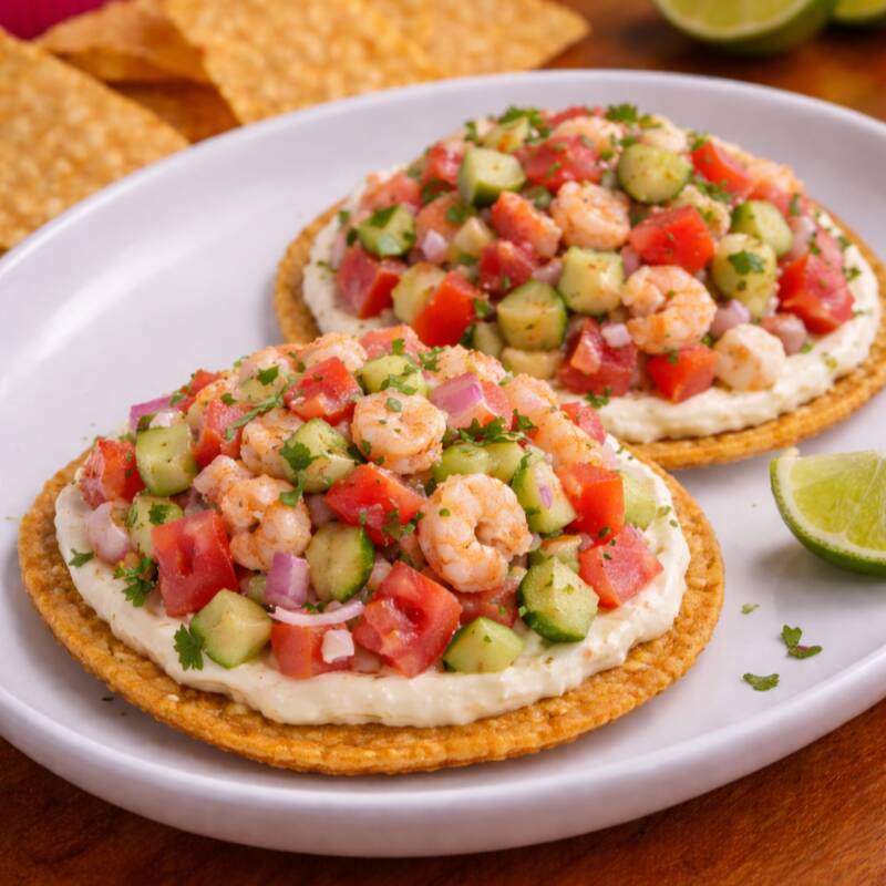 Camarón picado con pepino, tomate y cebolla, servido sobre doble tostada con un toque de mayonesa, pensado especialmente para los más pequeños.