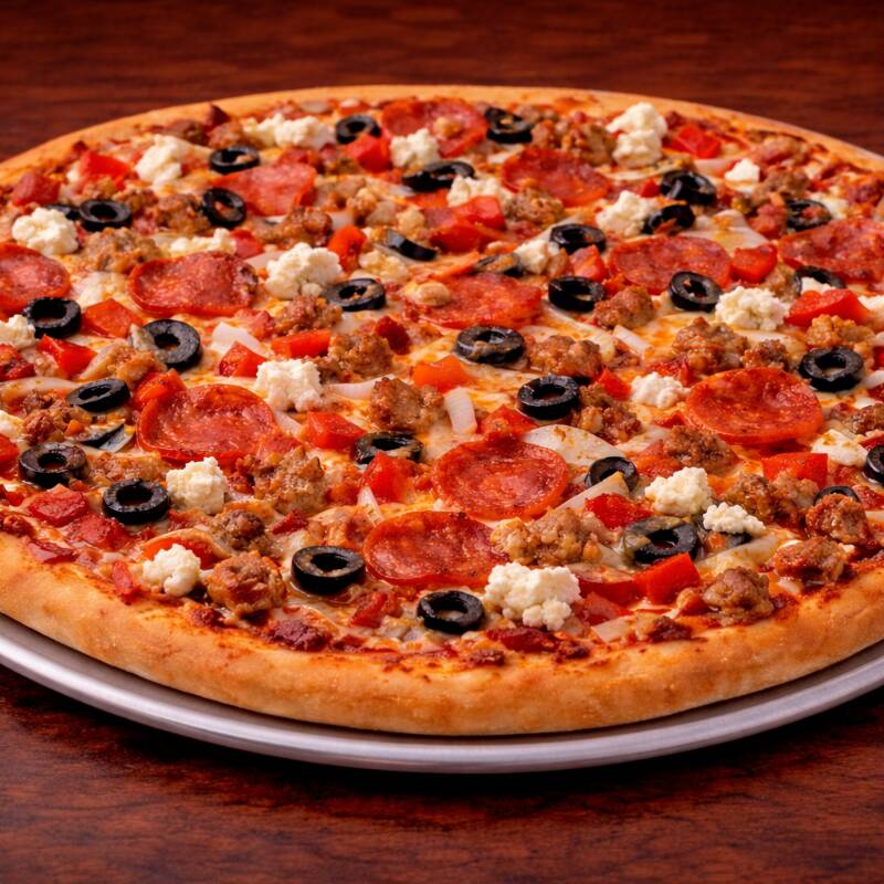 Pepperoni, salchicha italiana, aceituna negra, pimiento morron, cebolla blanca y queso de cabra