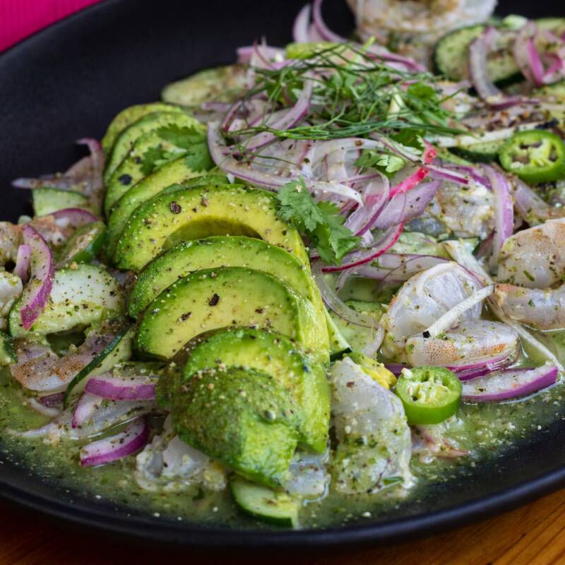 Camarón fresco marinado al momento en limón natural, con chile serrano y un toque herbal que resalta su frescura, un clásico del puerto.