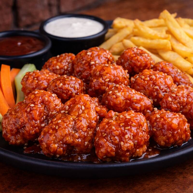 Peperoni y Boneless en salsa BBQ o Búfalo. Una combinación potente y llena de sabor.