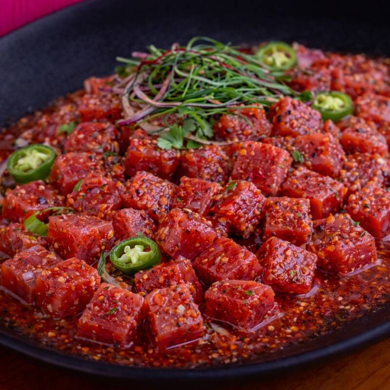 Cubos de atún fresco marinados suavemente en limón y salsa verde o roja, logrando un equilibrio perfecto entre frescura, acidez y picor. Si lo quieres: