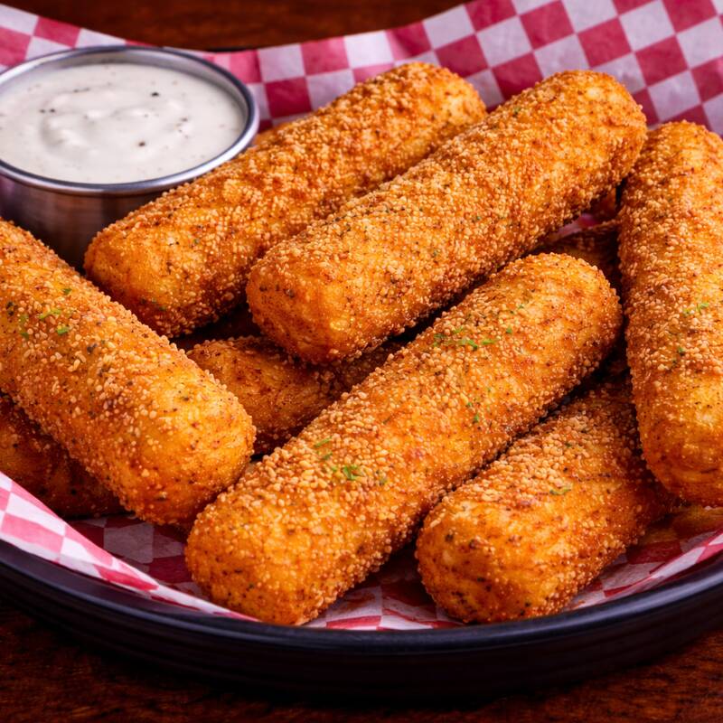 Crujientes dedos de queso con ranch y queso gratinado a la leña.
