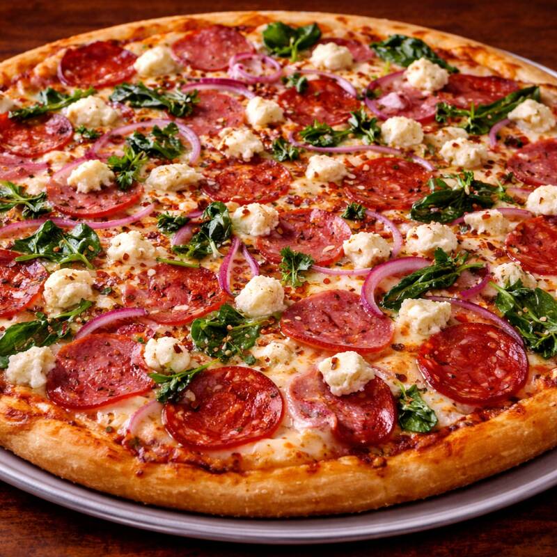 Pepperoni, salami, cebolla morada, espinaca y queso de cabra