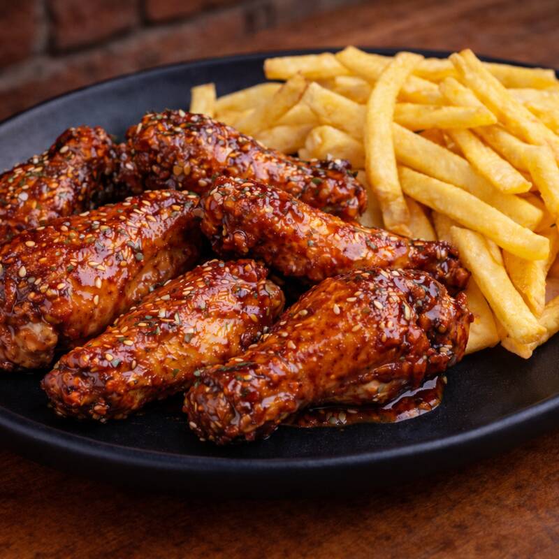 Alitas de pollo acompañadas de papas francesas.