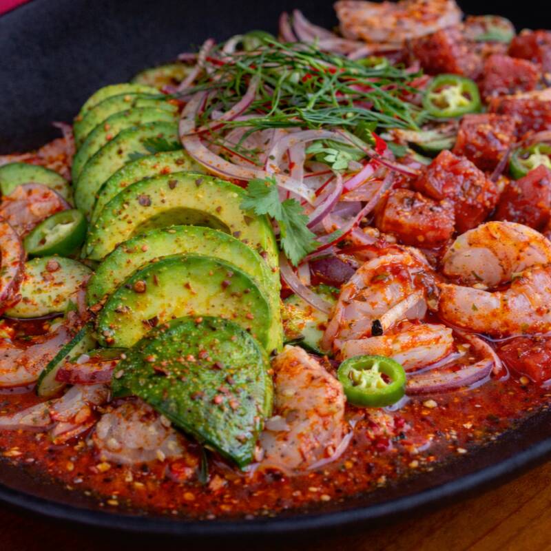Selección fresca de camarón y atún, combinados con pepino, cebolla y limón, ideales para botanear y compartir con el auténtico sabor del puerto.