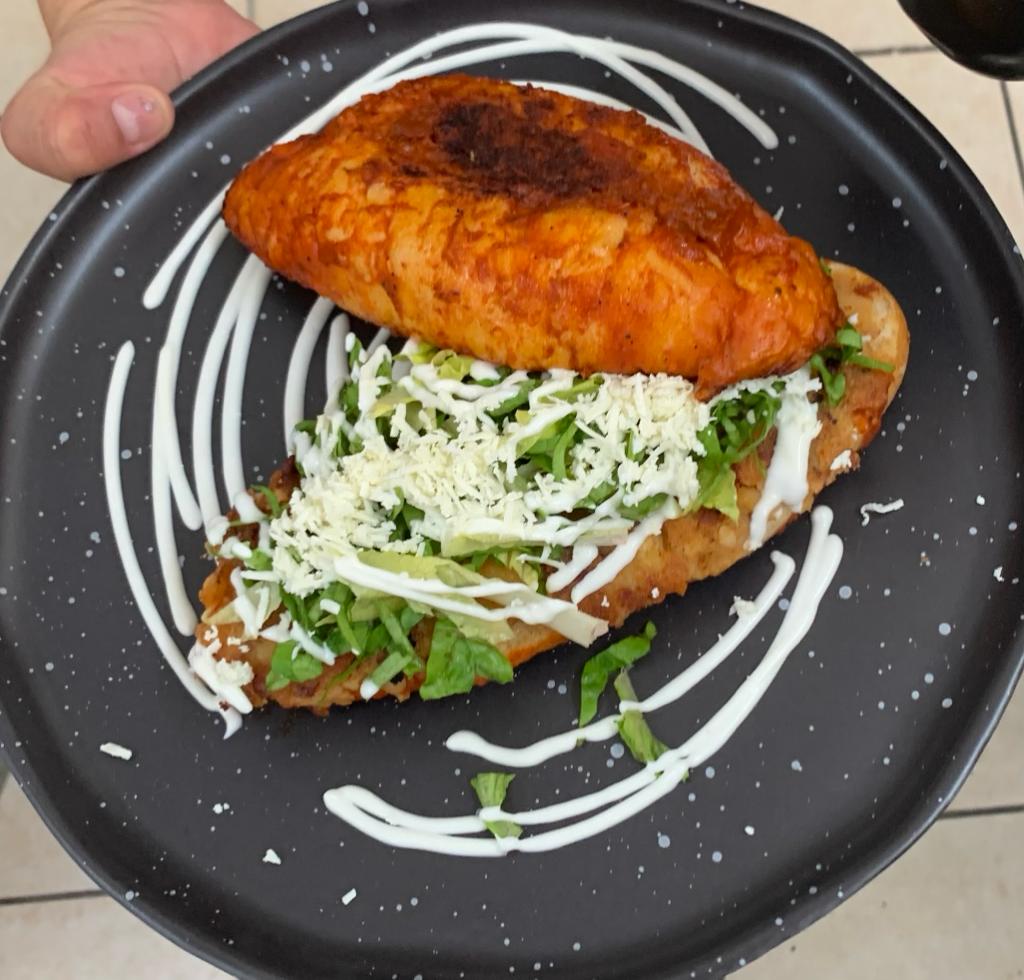 Bolillo bañado en salsa de guajillo y dorado a la plancha, relleno de papa con chorizo, servido con lechuga, queso cotija rallado y crema ácida.