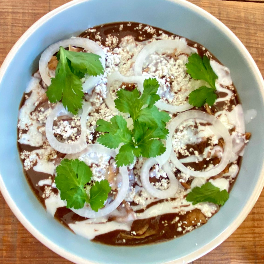 Totopos bañados en salsa de jitomate asado y chiles secos, decorados con aritos de cebolla, cilantro, queso cotija rallado y crema ácida.