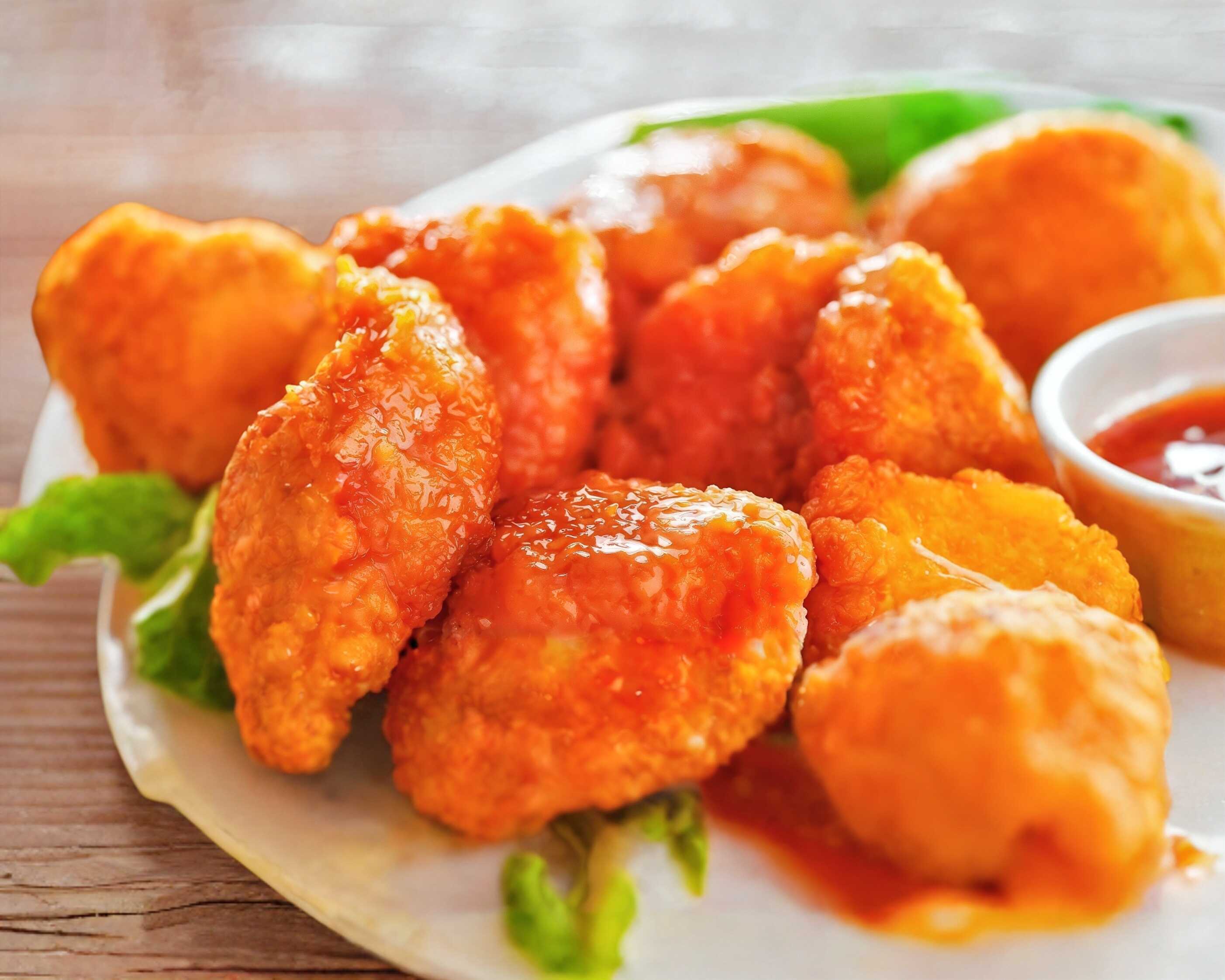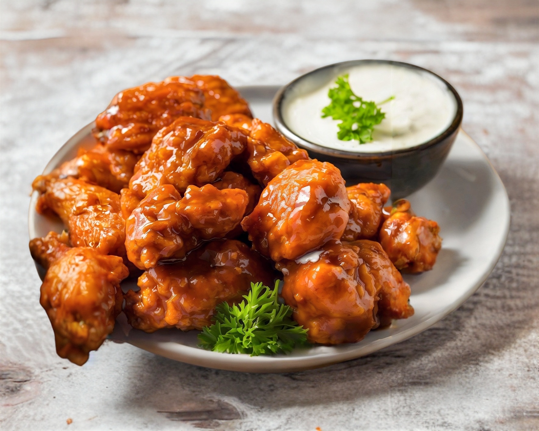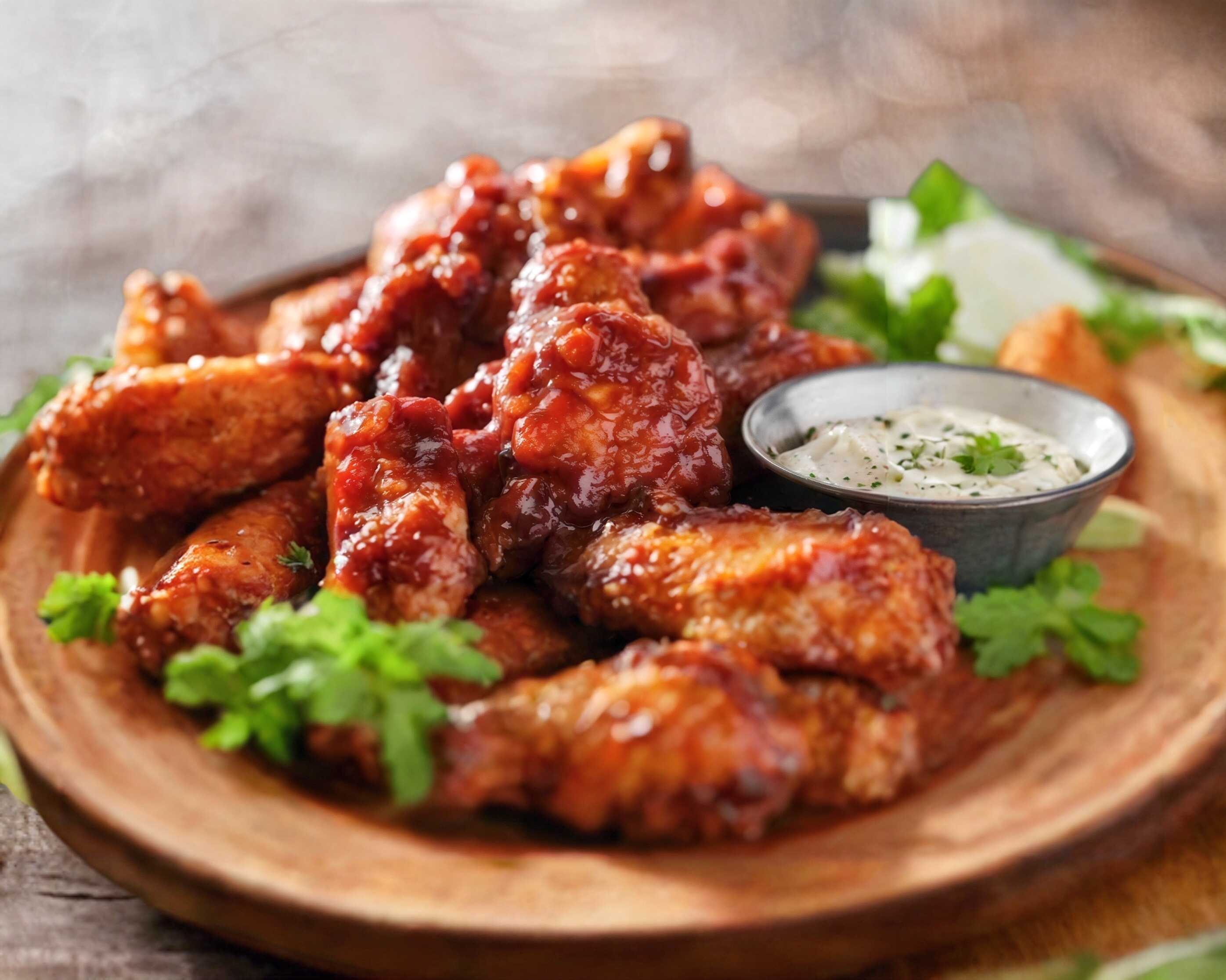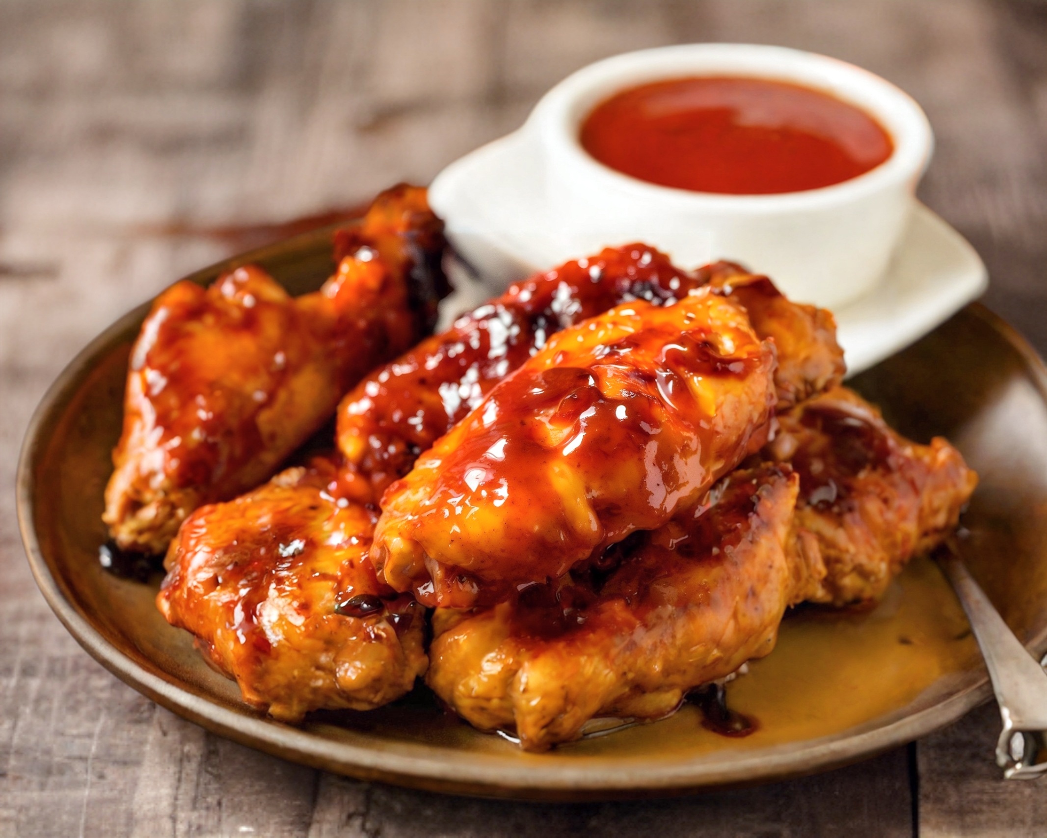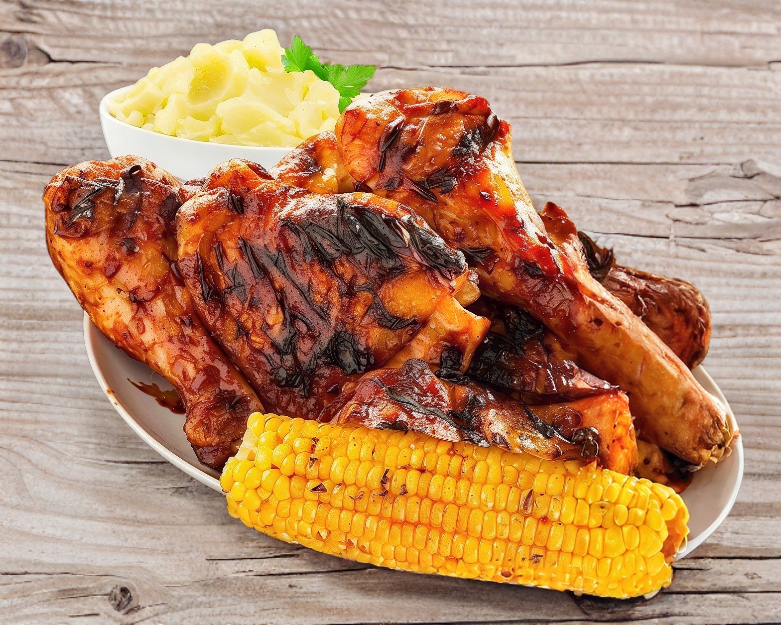 Pollo bañado en salsa BBQ. Acompañafo de elote amarillo, puré de papa con gravy y pan con mantequilla