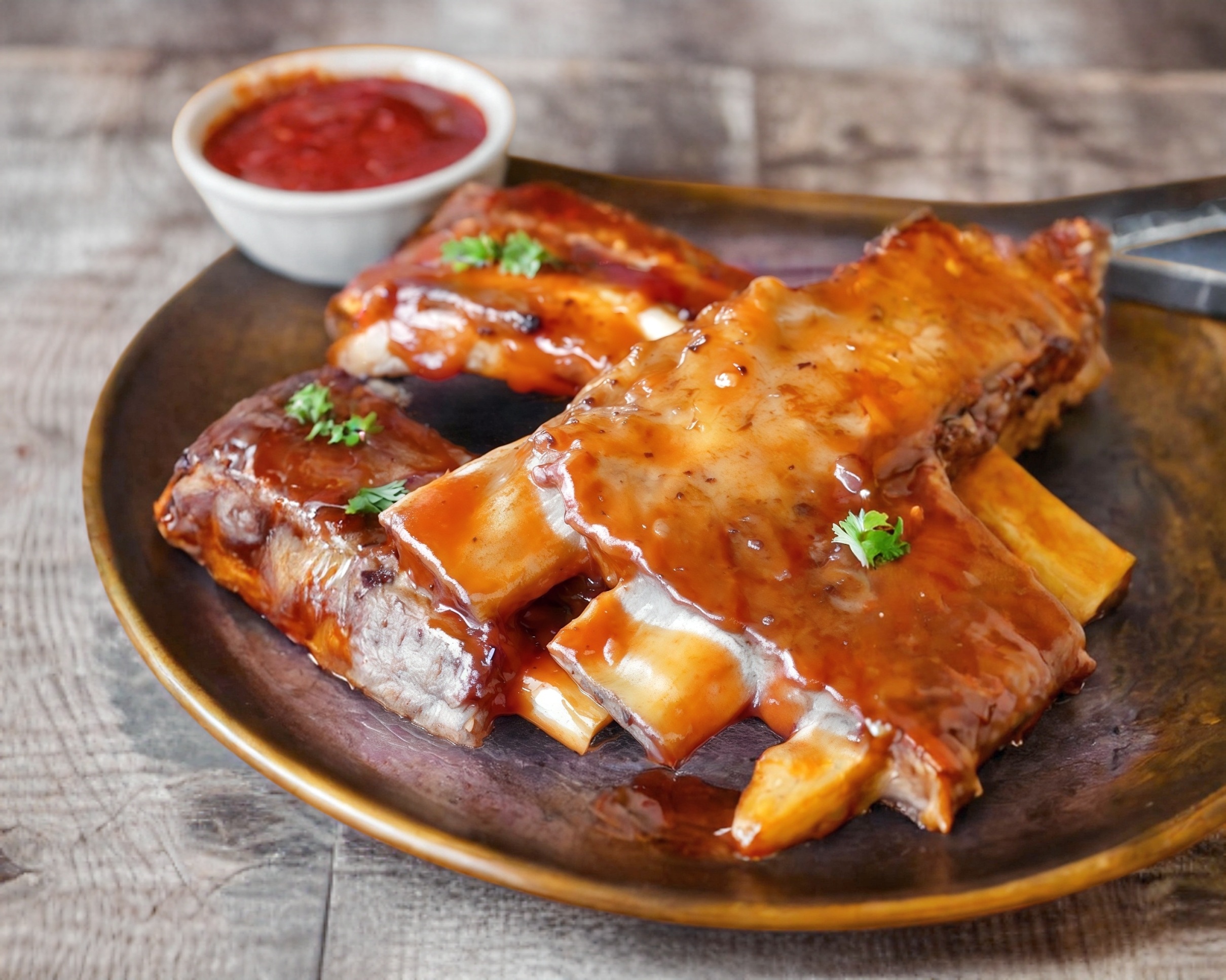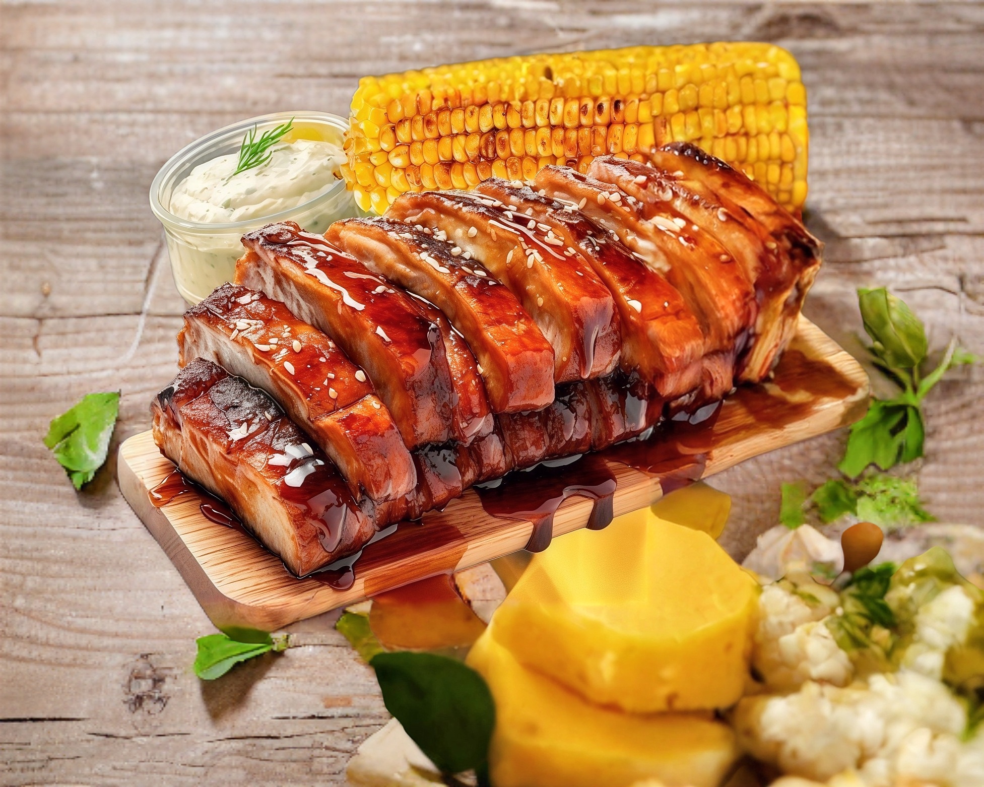 Costilla BBQ, Acompañafo de elote amarillo, puré de papa con gravy y pan con mantequilla