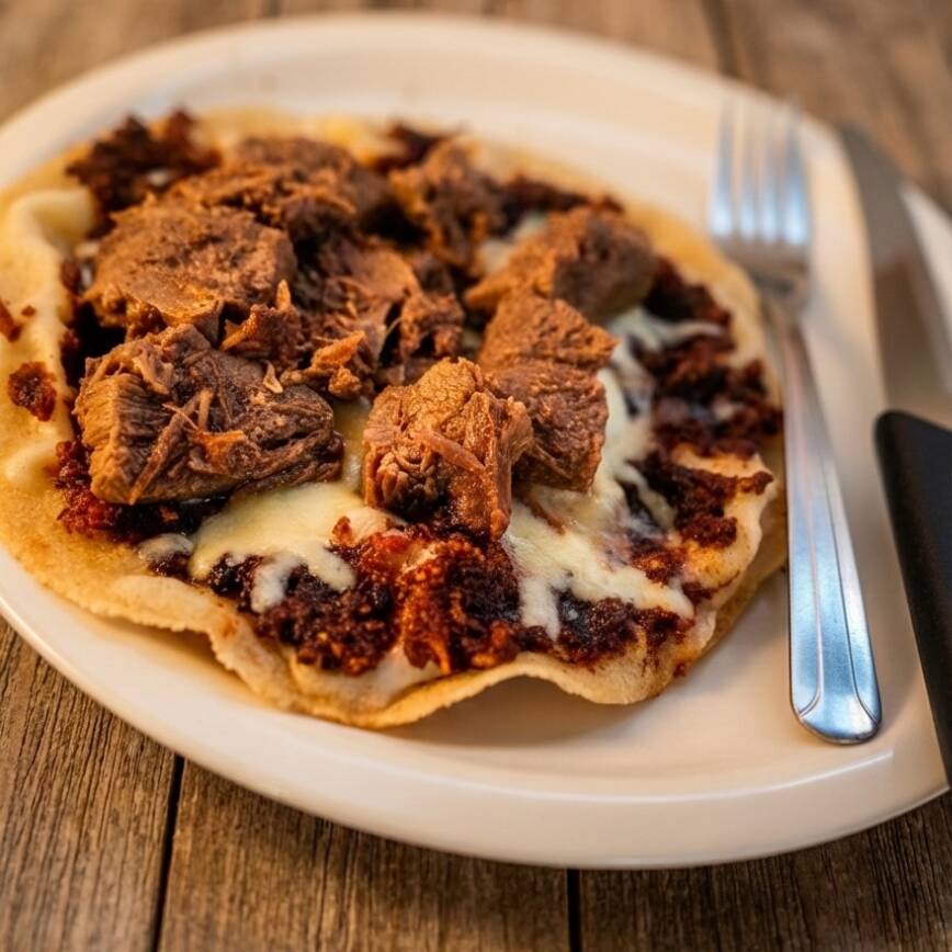 Tortilla hecha a mano con queso derretido y carne de cabeza de res.