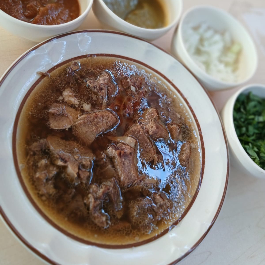 Caldo de res con lengua y cabeza, acompañado con tortillas hechas a mano, verdura y salsas. Tamaño grande.