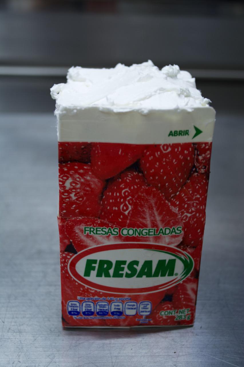 283 gramos de fresa congelada, crema chantilly y lecherita