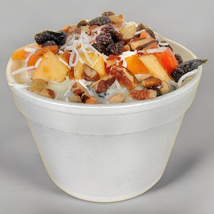 fruta picada manzana melón papaya y fresa, en embace de medio litro con cobertura de coco rayado nuez, pasas y lecherita