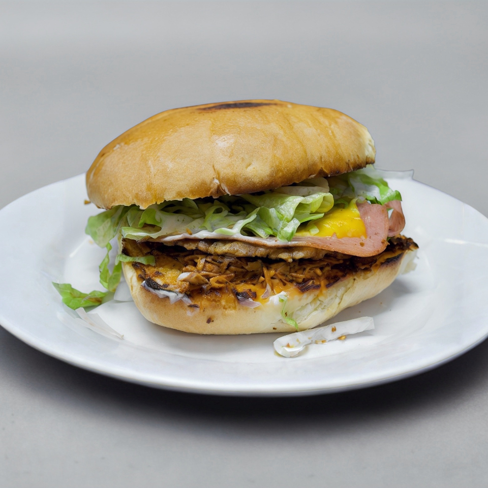 Carne de hamburguesa, jamón, queso amarillo, crema, tomate, cebolla y lechuga.
