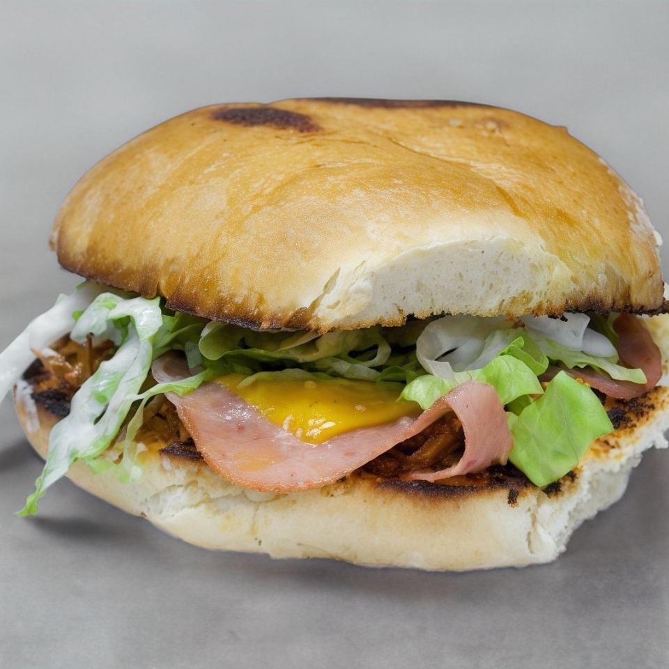 Jamón y queso, tomate, Cebolla, lechuga y crema.